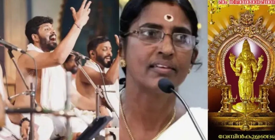 കോട്ടയം : കോട്ടയം വേമ്പിൻകുളങ്ങര ശ്രീ മഹാവിഷ്ണു ക്ഷേത്രത്തിൽ ഭജന അവതരിപ്പിക്കുന്നതിനിടെ നന്ദഗോവിന്ദം ഭജൻസ് ടീം ക്രിസ്തീയ ഗാനം ആലപിച്ചതിനെതിരെ ഉയർന്ന വിമർശനങ്ങൾക്ക് മറുപടിയുമായി ക്ഷേത്ര പുനരുദ്ധാരണ കമ്മിറ്റി കൺവീനർ. ഈ നാട്ടിലുള്ള എല്ലാ വിഭാഗം ജനങ്ങളും, അതിന് ഇന്ന മതം എന്നൊന്നുമില്ല എല്ലാവരും ഒരുമിച്ച് സഹകരിച്ചാണ് ഈ പ്രോഗ്രാം ഇവിടെ നടത്തിയതെന്ന് കൺവീനർ വ്യക്തമാക്കി.